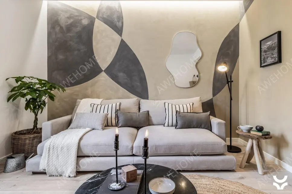 The living room includes a comfortable sofa and a complete entertainment system, making it an ideal spot for a relaxing evening. Abstract decorative walls combined with wooden furniture create a strong alpine atmosphere. The fully equipped kitchen comes with a refrigerator, microwave, oven, stovetop, and various cooking utensils, allowing you to prepare delicious meals during your stay. A dining area with a four-person table provides a pleasant space for enjoying your meals.